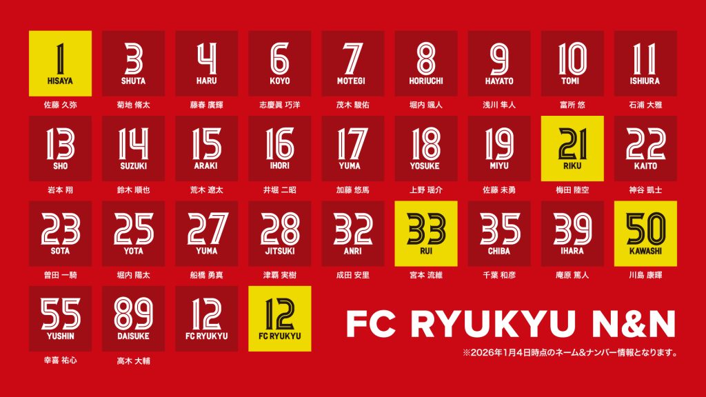 ▼2026シーズン登録選手ネーム&ナンバー(1月4日時点)